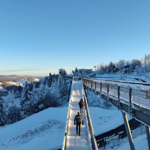 Herzstück des Erlebnisberg Kappe ist die imposante Panorama Erlebnis Brücke, ein 20 Meter hoher Wanderweg über den Baumwipfeln. Von hier aus haben Spaziergänger einen tollen Blick über Winterberg, die Veltins-EisArena und die umliegenden Höhenzüge, sowie natürlich die weiteren Anlagen und Attraktionen im Winterberger Freizeitpark. Für den Extra-Kick sorgen fünf Spaßelemente: Schwindelfreie Besucher hangeln sich in luftiger Höhe, umgeben von sicheren Schutznetzen, über schwankende Brücken oder schaukelnde Plattformen.
